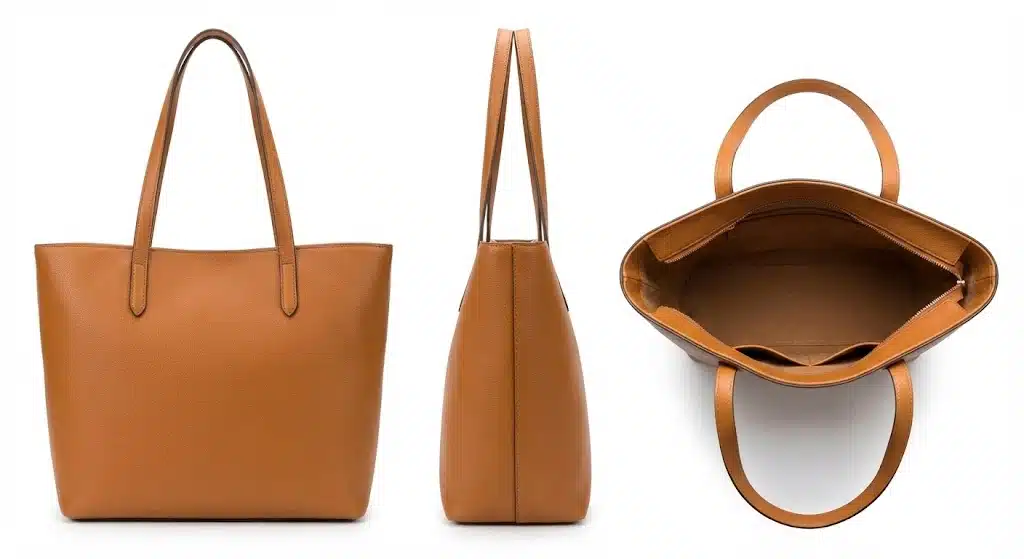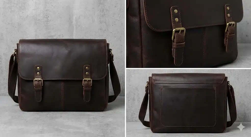 Views: Full front view, close-up of buckle details, and a view of the back pocket.