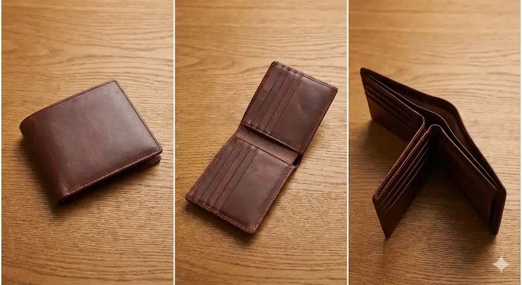 Views: Closed, open flat showing card slots, and open showing bill compartment.